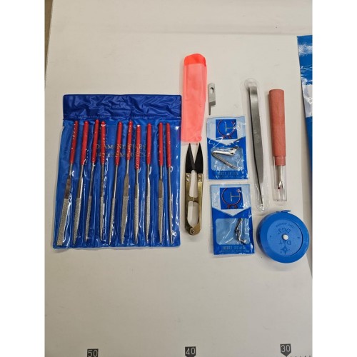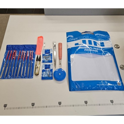 В комплекте: игловодители, запасное лезвие, набор натфилей (10 штук), пинцет, рулетка-сантиметр, вспарыватель, снипер.