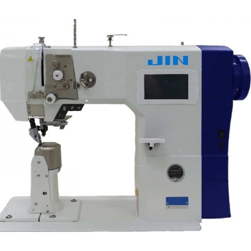 Колонковая промышленная швейная машина Juki JIN NA-35UT-1K с автоматической обрезкой нити с верхним роликовым продвижением и цифровым контролем длины стежка.