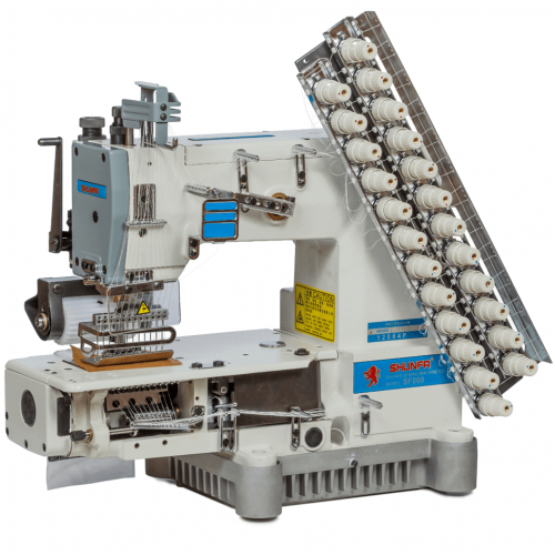 4-х игольная машина двухниточного цепного стежка с цилиндрической платформой (поясная машина) для притачивания резинки с пуллером.