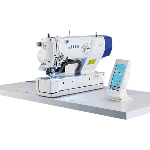 Электронная высокоскоростная петельная машина челночного стежка с прямым приводом Juki JIN B1-E1790 с автоматической обрезкой нитей, автоматическим подъемом лапки. В данной машине полусухая голова. Электронная система натяжения нити. Цветная ЖК панель. Блок управления CB10.