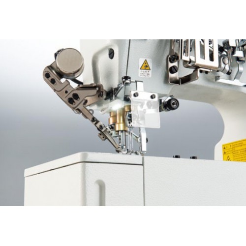 Распошивальная машина, трёхигольный плоский шов с верхним и нижним застилами, тип иглы UYx128GAS, прямой привод, автоматическая смазка, плоская платформа, расстояние между иглами 5,6мм, регулировка шага стежка нажатием кнопки, регулировка дифференциальной подачи с помощью рычага.